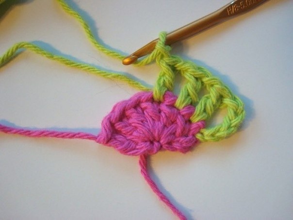 4р: (3 в.п., 1 ст с/н) в первый ст с/н 3-го ряда, (3 в.п., пропускаем 1 ст с/н, 2 ст с/н в один ст с/н, 2 ст с/н в след.ст с/н) 5 раз, 3 в.п., 2 ст с/н в последний ст с/н ряда.